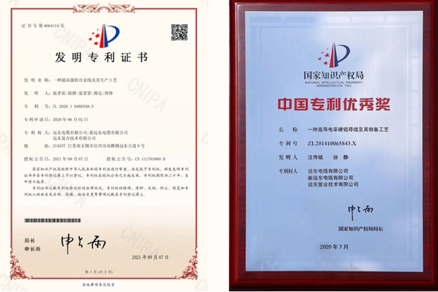 由遠東電纜經(jīng)過多年技術攻關研發(fā)出的特高壓線路用高導鋁及鋁合金系列產(chǎn)品是具有多項發(fā)明專利的核心產(chǎn)品,無論是硬鋁導電率還是高強度鋁合金導電率等性能都處在國際領先水平,并榮獲中國專利獎。